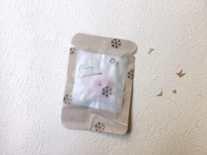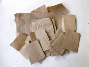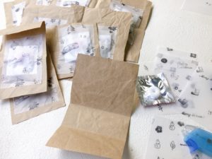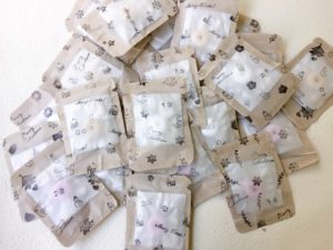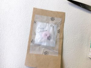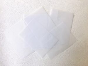 両面テープを剥がし、雑紙の上にお菓子を置いて上からトレーシングペーパーを貼り付けます。