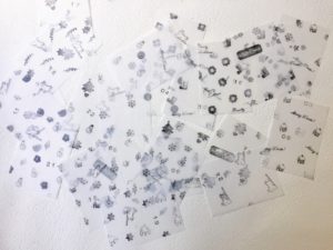 切ったトレーシングペーパーにスタンプや油性ペンで1~24までの数字とイラストや文字を書き込みます。