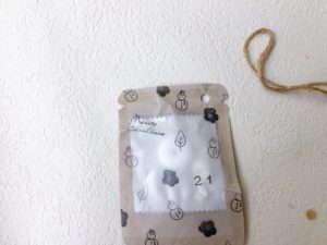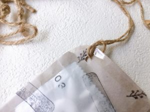 穴あけパンチで穴を開け、麻ひもを通しました。