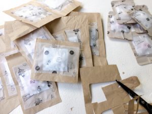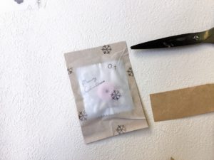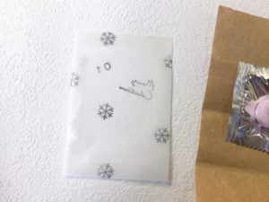 両面テープを剥がし、雑紙の上にお菓子を置いて上からトレーシングペーパーを貼り付けます。