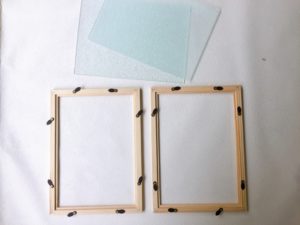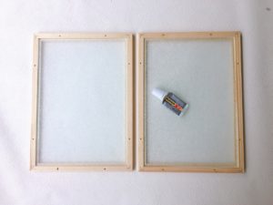 木製フレームにアクリルパネルを接着します。