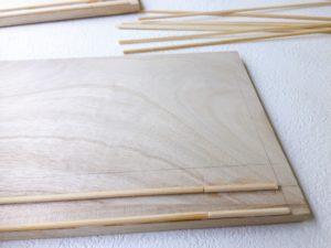 切った木板に竹ひごを木工用ボンドで付けます。
