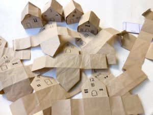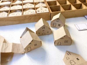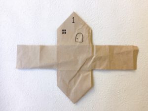 三角に折った部分に窓やドア、数字をペンで書きます。