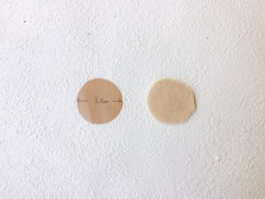 1、フェルトを直径3.2cmの丸にカットします(今回は1枚使用)。